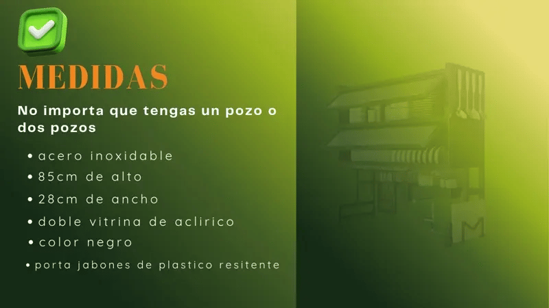 Nuestra platera está fabricada en acero inoxidable de alta calidad, lo que la hace duradera, resistente a la corrosión y al óxido. Está diseñada para soportar el contacto diario con agua y humedad, por lo que puedes usarla con total confianza en la cocina sin preocuparte de que se deteriore.